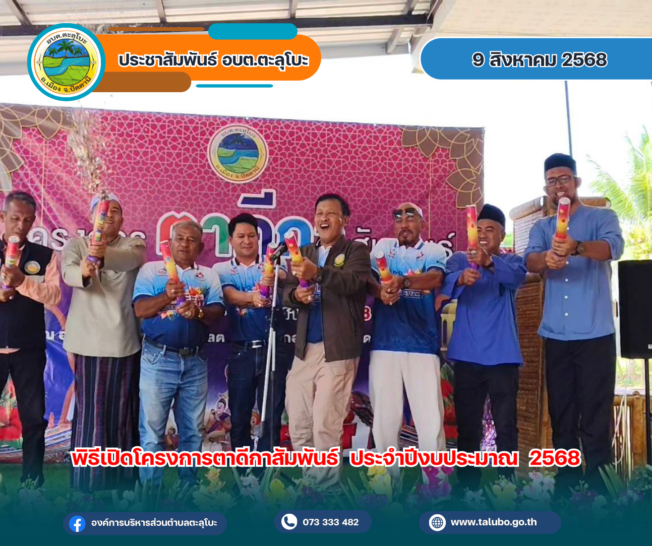 นายเจะอับดุล มูรอหัต นายก อบต.ตะลุโบะ มอบหมายให้นายณกร คงคาลิหมีน ปลัด อบต.ตะลุโบะ เป็นประธานการเปิดพิธีโครงการตาดีกาสัมพันธ์ ประจำปีงบประมาณ 2568 จัดขึ้นในวันที่ 9-10 สิงหาคม 2568 ณ สนาม อบต.ตะลุโบะ